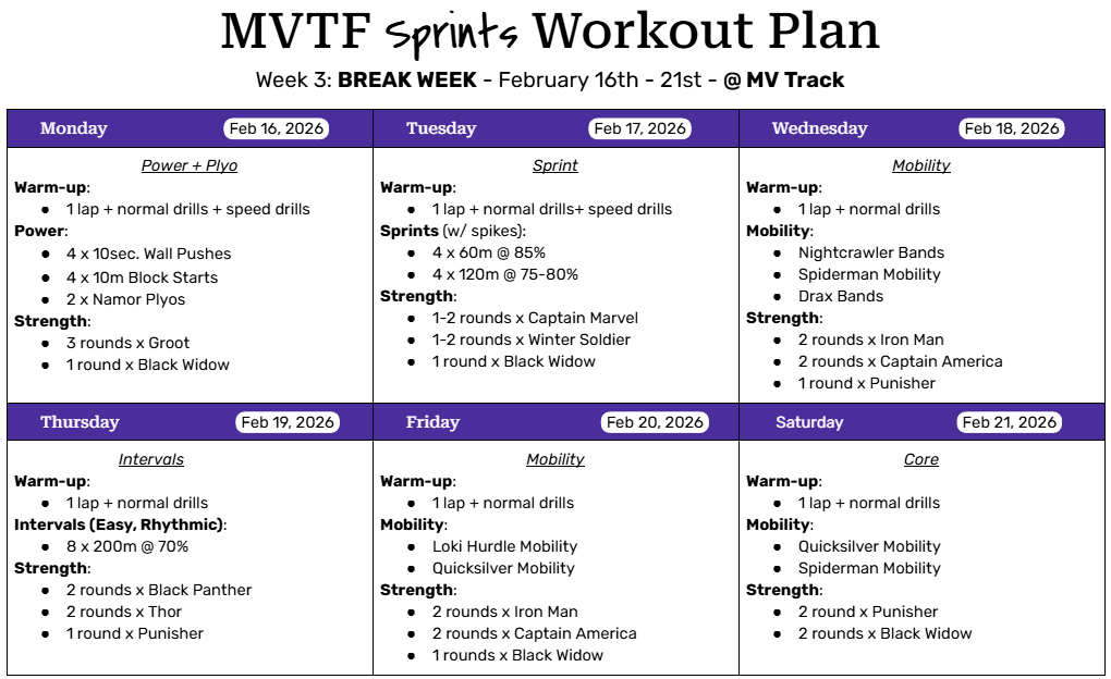 Two weeks down, and we’re already looking like a force to be reckoned with! Attendance has been solid, but we’re still waiting on our winter sport athletes to wrap up their seasons. We’re cheering for them…but also secretly can’t wait until they are done and join us on the track. The coaches are very, very excited for the season ahead!