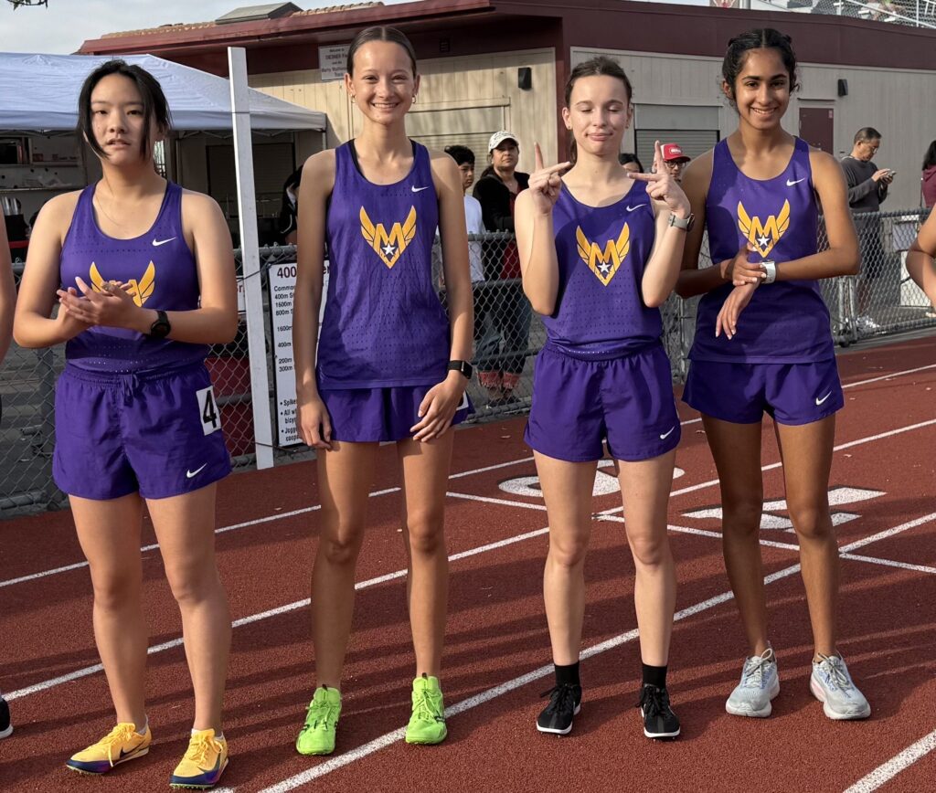 Firebird handed out medals for top 6 in individual events and top 3 for relays. They also do this cool thing where they comprise a “relay” in the events that don’t already have a sanctioned relay (field events, hurdles, and the 3200m) by combining the top 3 athletes’ marks from each school. Our medal winners started on the track with a trio of boys in the Varsity 1600m. Ethan Yang earned 3rd place with Riu Yamada in 5th and Tarun Gandhi in 6th. Mel Zhao and Taylor Orr both earned medals in the F/S girls 1600m as well with 3rd and 4th places finishes, respectively. Our Varsity boys 4x100m relay of Max Shaykin, Jeffrey Choy, Jake Tong, and Jayden Tang earned a close 2nd place finish to get our first relay medal of the day. That was quickly followed up by a 2nd place in the F/S girls DMR from the team of Medha Rustagi, Sarah Kumar, Sophia Li, and Kaitlyn Lum. The Varsity boys DMR of Ethan Yang, Choy, Kento Murase, and Gandhi earned a 3rd place medal. Big shoutout to Murase for jumping in to run the 800m leg of the DMR after Sam Heinonen had a tweak in his leg and couldn’t race! In the Varsity boys 400m, Ivan Shliakhov showed he’s getting back to form with a 4th place finish and his season’s best time. Myra Mishra, Orr, Alex Perrault, and Li teamed up to win the F/S girls 4x800m relay! That was MV’s only relay win on the day! Shaykin earned a 5th place medal in the Varsity boys 100m. This was followed up by a win in the Varsity boys 800m by Yamada – our sole individual win of the day! Constantine Chua ran a huge PR in the 300m hurdles to take 3rd place. The Varsity boys SMR saw Shaykin, Tong, Choy, and Murase grab 3rd place medal. Zhao came back in the 3200m to earn a 2nd place medal for F/S girls which was preceded by Suhani Pahuja’s 3rd place finish for Varsity girls. To end things on the track, the Varsity boys 4x400m relay team of Jonah Chang, Chua, Yamada, and Choy crossed the line in 3rd place, earning the final track medal of the day. In the field Jasmine Zhao got a 5th place finish in the high jump for Varsity girls and Mya Vu earned a 6th place finish in F/S girls, with a new PR! Kingston Jourdan got a 3rd place in the shot put for Varsity boys and Adam Yang earned a 5th place medal in the F/S boys triple jump. For the other “relays” on the day, the F/S boys long jump earned a 3rd place with a team made up of Yang, Duncan Ross, and Oliver Perrault! Big shoutout to Perrault for driving back to the meet to get one jump in to secure the medal for his team (he’s not a jumper, he’s a distance runner)!! A final shoutout to the Varsity boys’ team for ending up 3rd overall out of the 19 schools in attendance!
